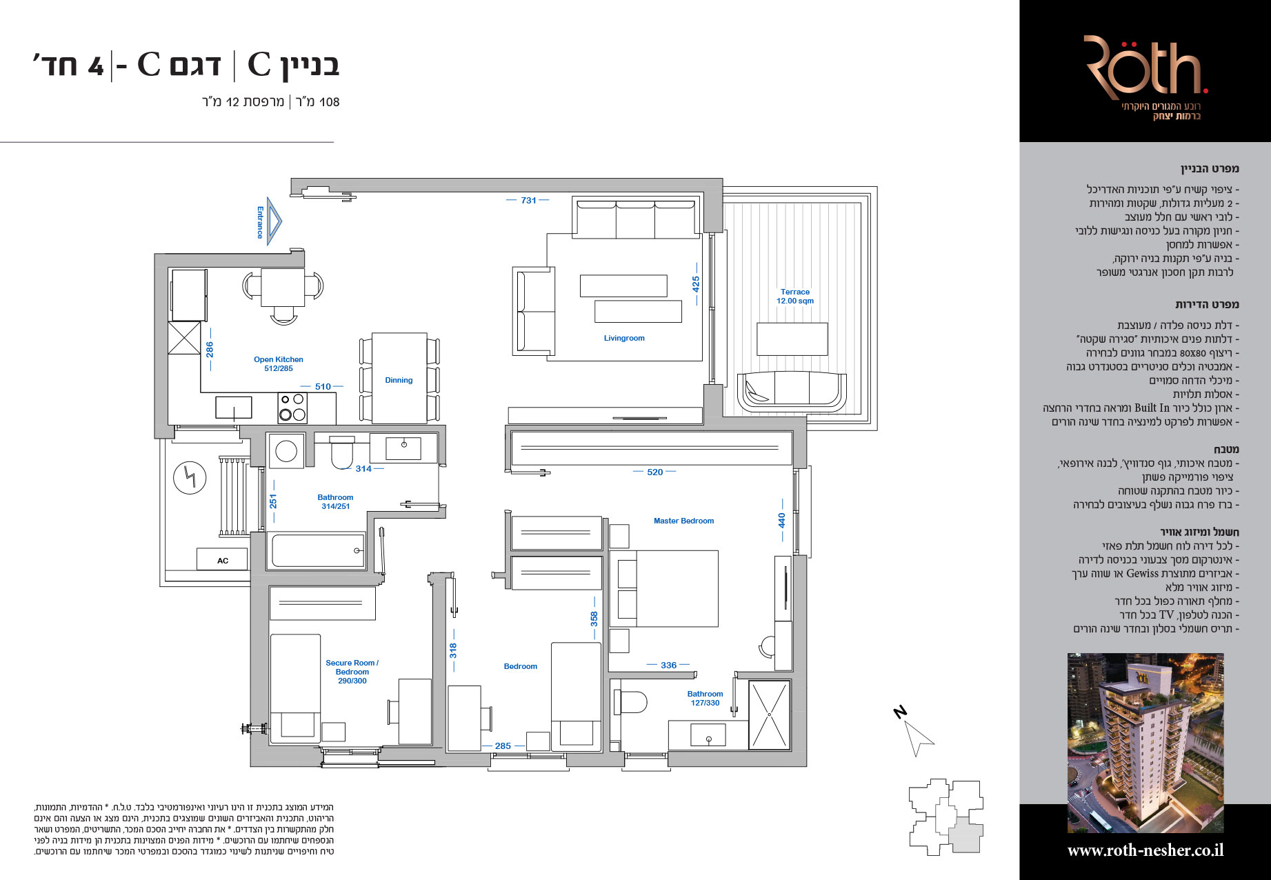 4 חד' 108 מ"ר + מרפסת 12 מ"ר