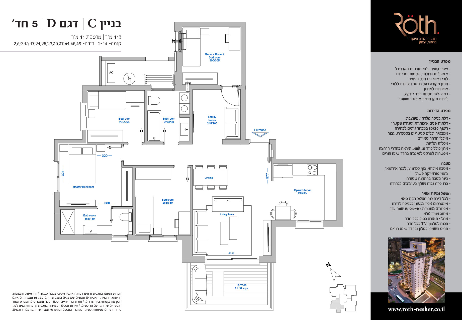 5 חד' 113 מ"ר + מרפסת 11 מ"ר